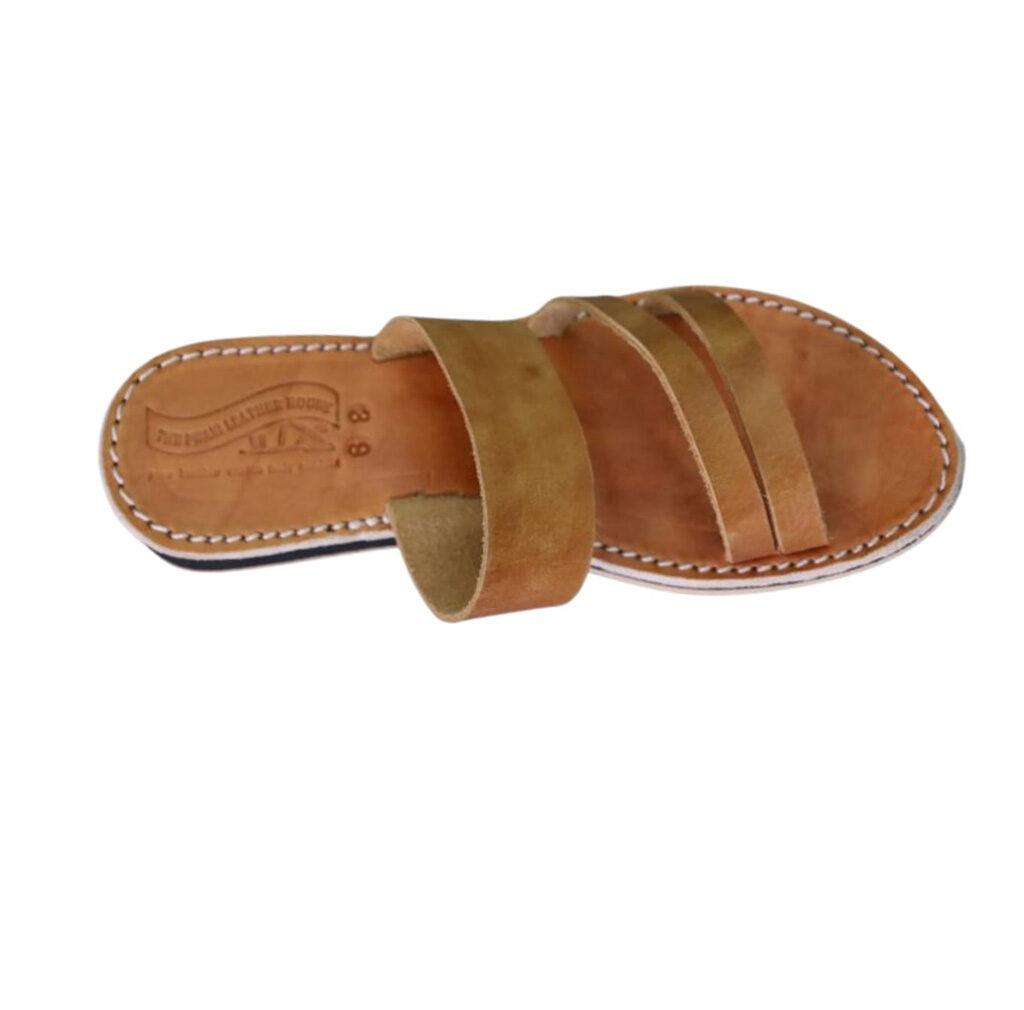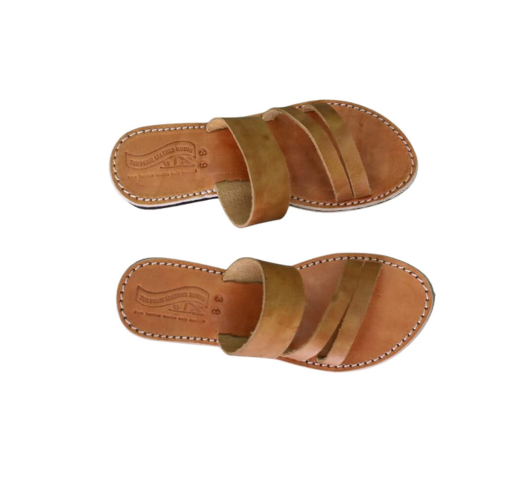 Brown leather slide sandals with crossing straps. Comfy leather lining and hard-wearing outsole. Our unique sandal was named after an animal who is best known for its courage and ferocity. It symbolizes strength, admiration and fearlessness.
